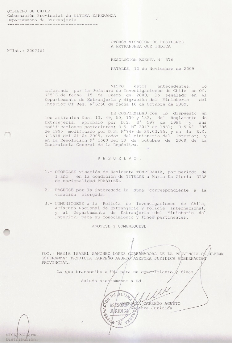 OTORGAMIENTO DE VISA DE RESIDENCIA A CIUDADANA DE NACIONALIDAD BRASILEÑA, MARIA DA GLORIA DIAS |