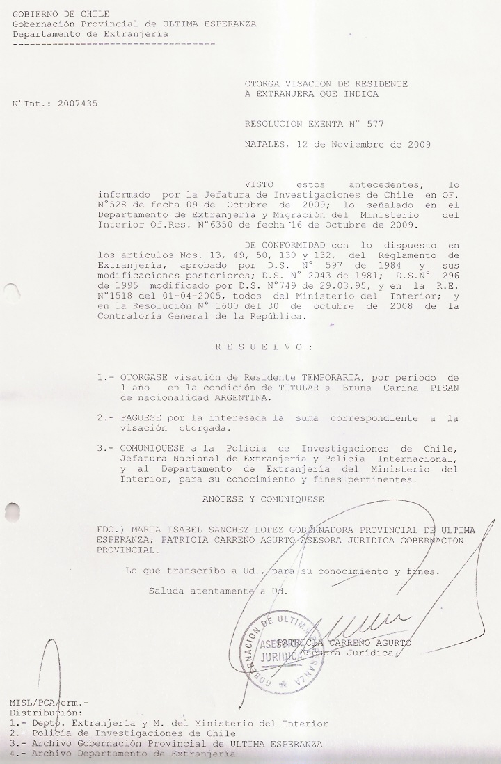 OTORGAMIENTO DE VISA DE RESIDENCIA A CIUDADANA DE NACIONALIDAD ARGENTINA, BRUNA CARINA PISAN |