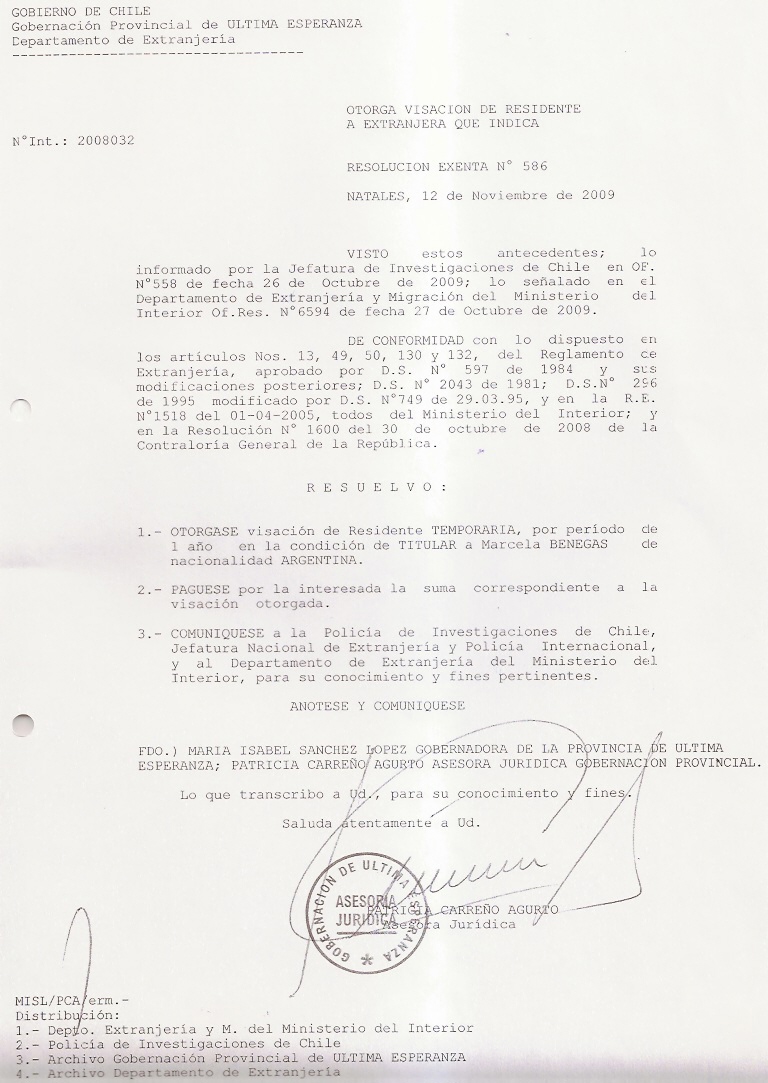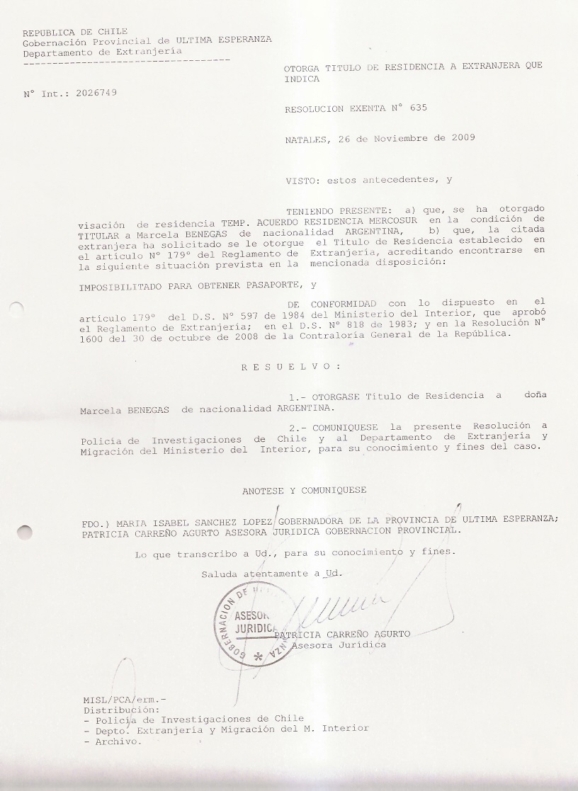 TITULO DE RESIDENCIA A CIUDADANAN DE NACIONALIDAD ARGENTINA, MARCELA BENEGAS |