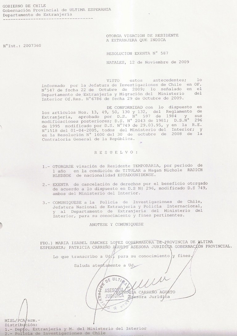 OTORGAMIENTO DE VISA DE RESIDENCIA A CIUDADANA DE NACIONALIDAD ESTADOUNIDENSE, MAGAN NICHOLE RADICH BLEDSOE |