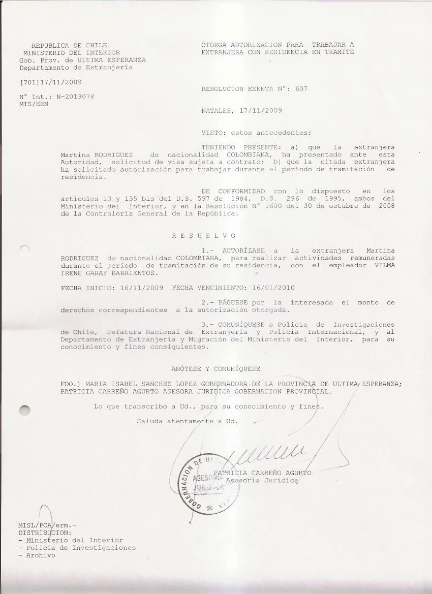 AUTORIZACION PARA TRABAJAR CON VISA EN TRAMITE A CIUDADANA DE NACIONALIDAD COLOMBIANA MARTINA RODRIGUEZ |