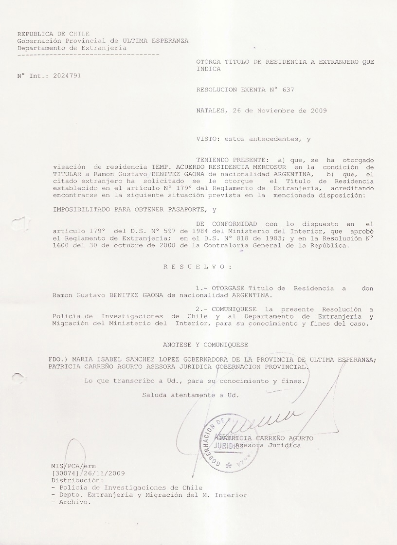 TITULO DE RESIDENCIA A CIUDADANANO DE NACIONALIDAD ARGENTINA, RAMON GUSTAVO BENITEZ GAONA |