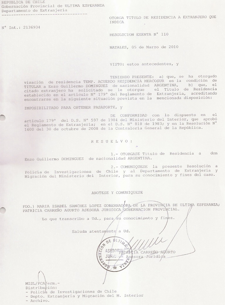 TITULO DE RESIDENCIA A CIUDADANO ARGENTINIO, ENZO GUILLERMO DOMINGUEZ |