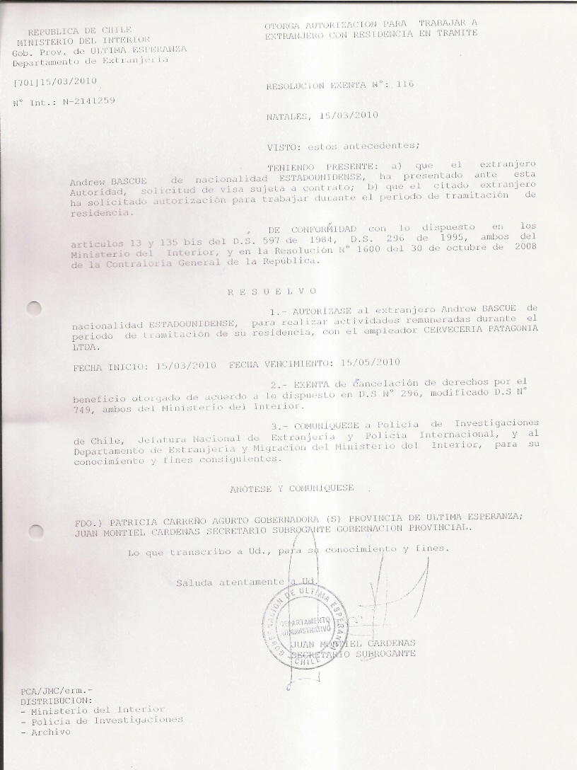 PARA TRABAJAR CON VISA EN TRAMITE A CIUDADANO DE NACIONALIDAD ESTADOUNIDENSE, ANDREW BASCUE |
