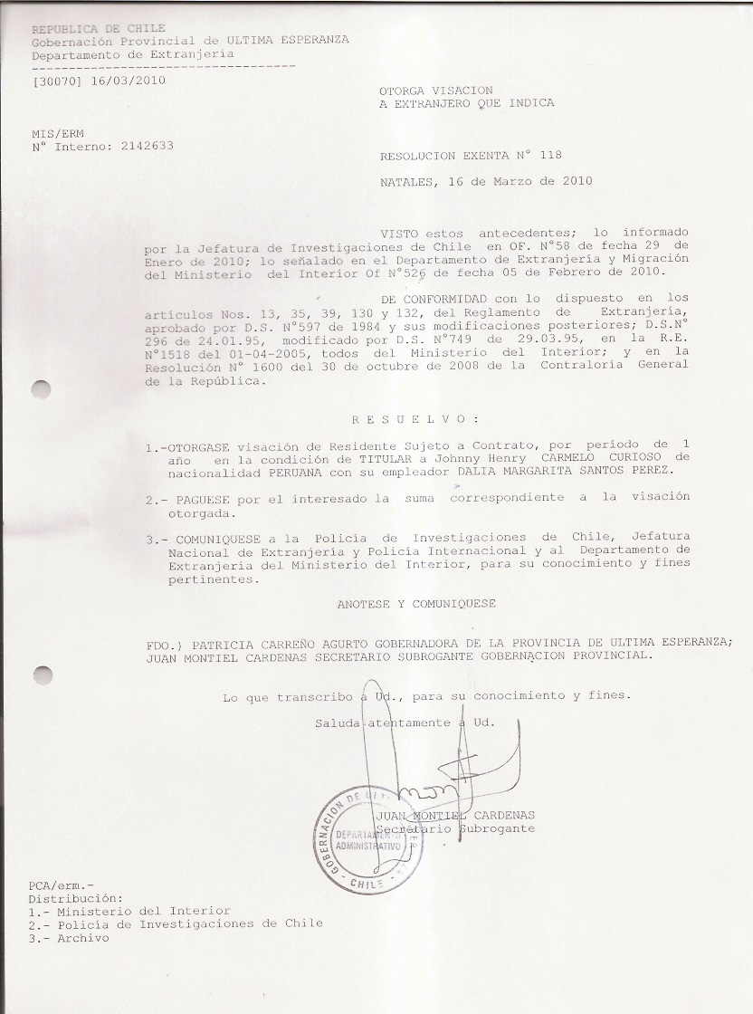 CURSO FAVORABLE A SOLICITUD DE VISA DE RESIDENCIA DE CIUDADANO DE NACIONALIDAD PERUANA, JOHNNY HENRY CARMELO CURIOSO |
